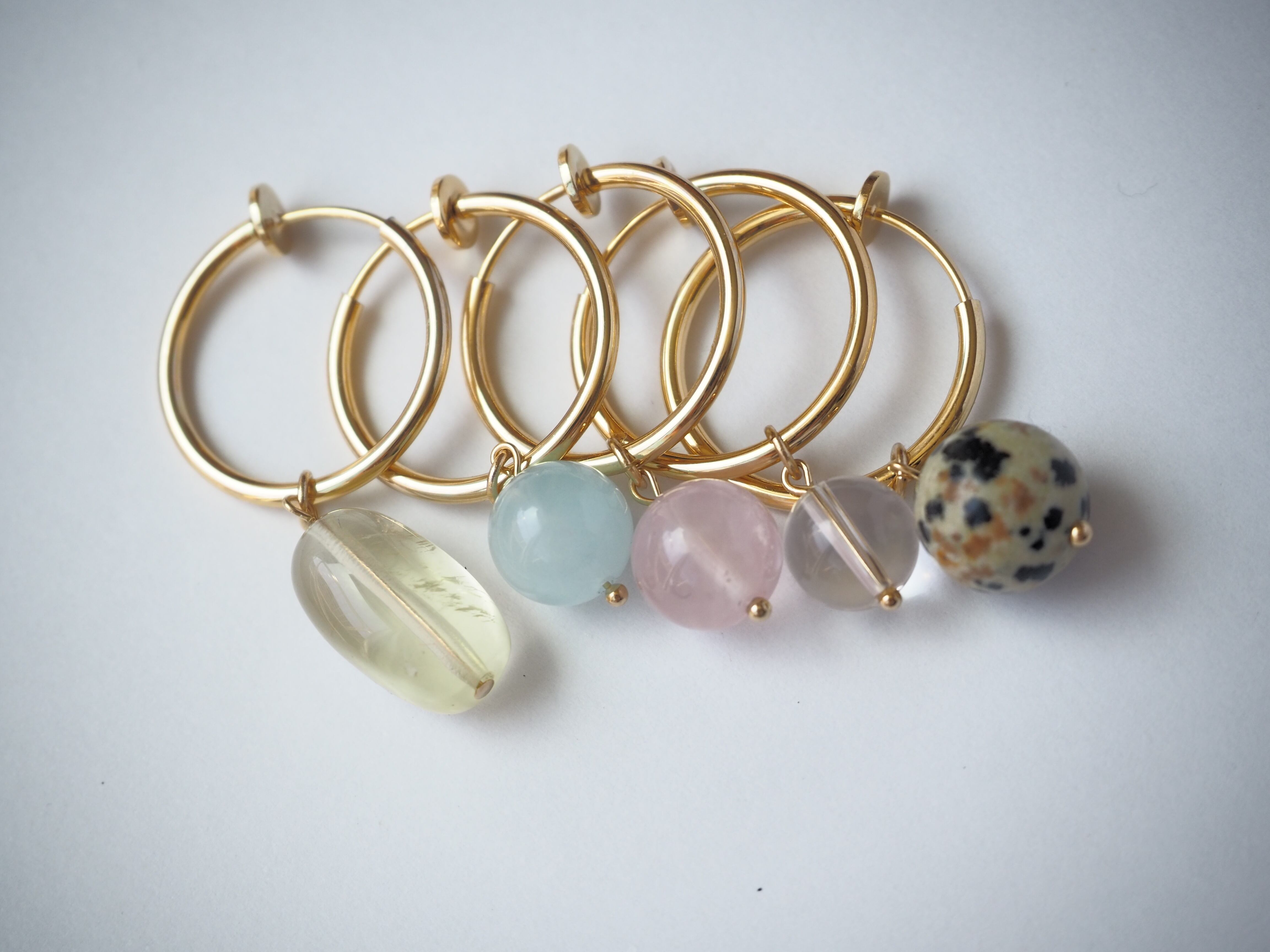色とりどりの天然石をあしらったシンプルなフープイヤリングです。
